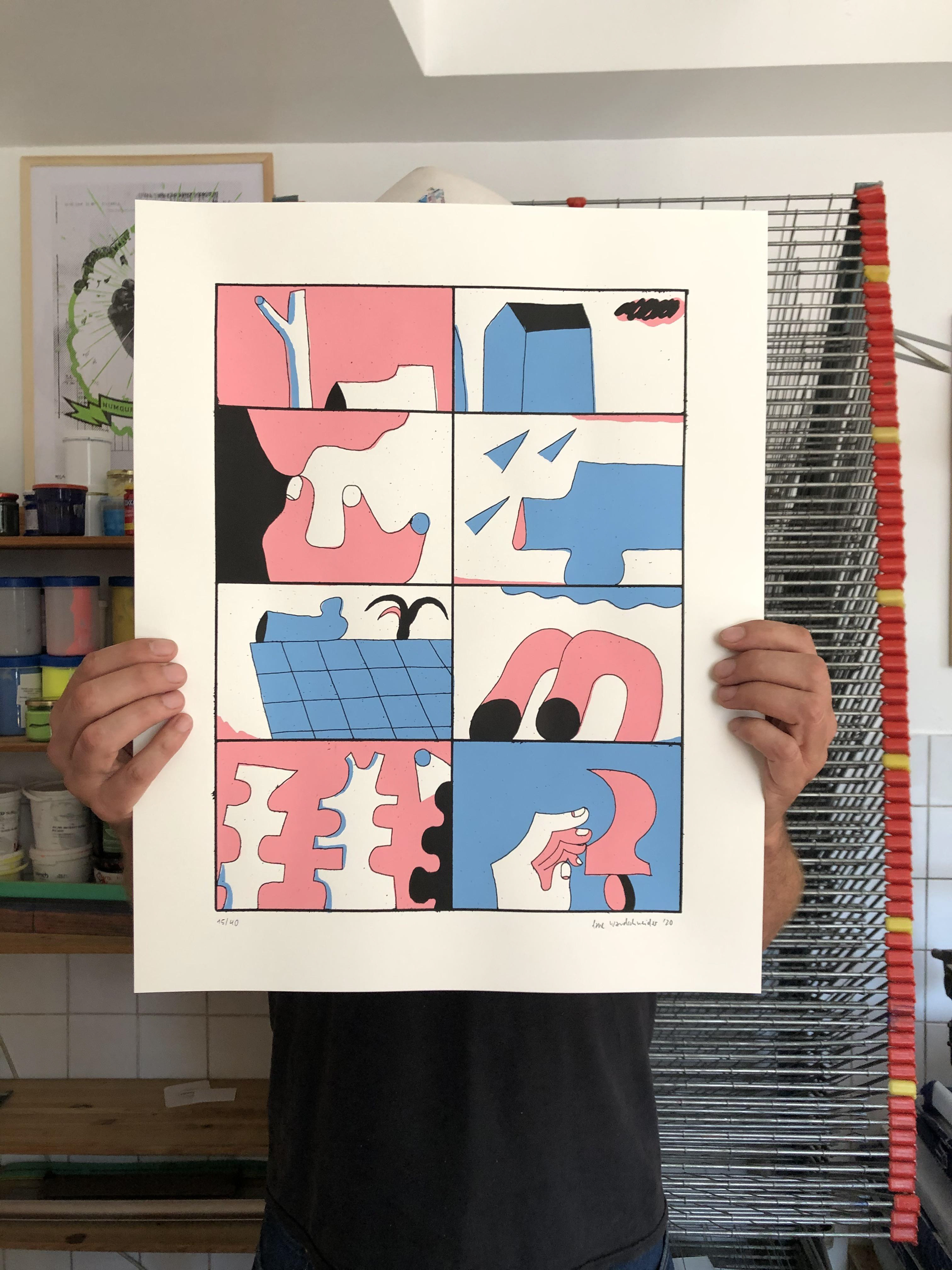 Lasse Wandschneider est un illustrateur allemand, originaire de Berlin. Il y a étudié ainsi qu’à Breda (Pays bas) et à Prague. Il vit désormais à Bruxelles où il travaille pour différents médias. Attiré par la sérigraphie et la risographie, il auto-édite de petits ouvrages que l’on pourrait qualifier de bandes dessinées abstraites.