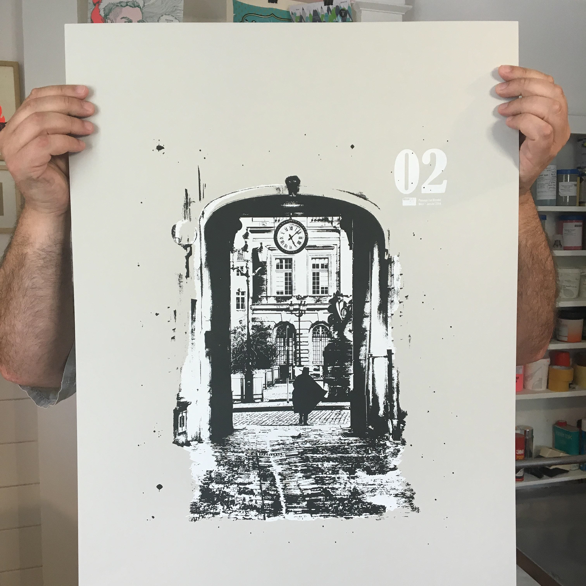 . Impression deux couleurs sur papier pop set virgin pulp tourterelle 250g. 24 tirages signés et numérotés, format 50x70 cm.