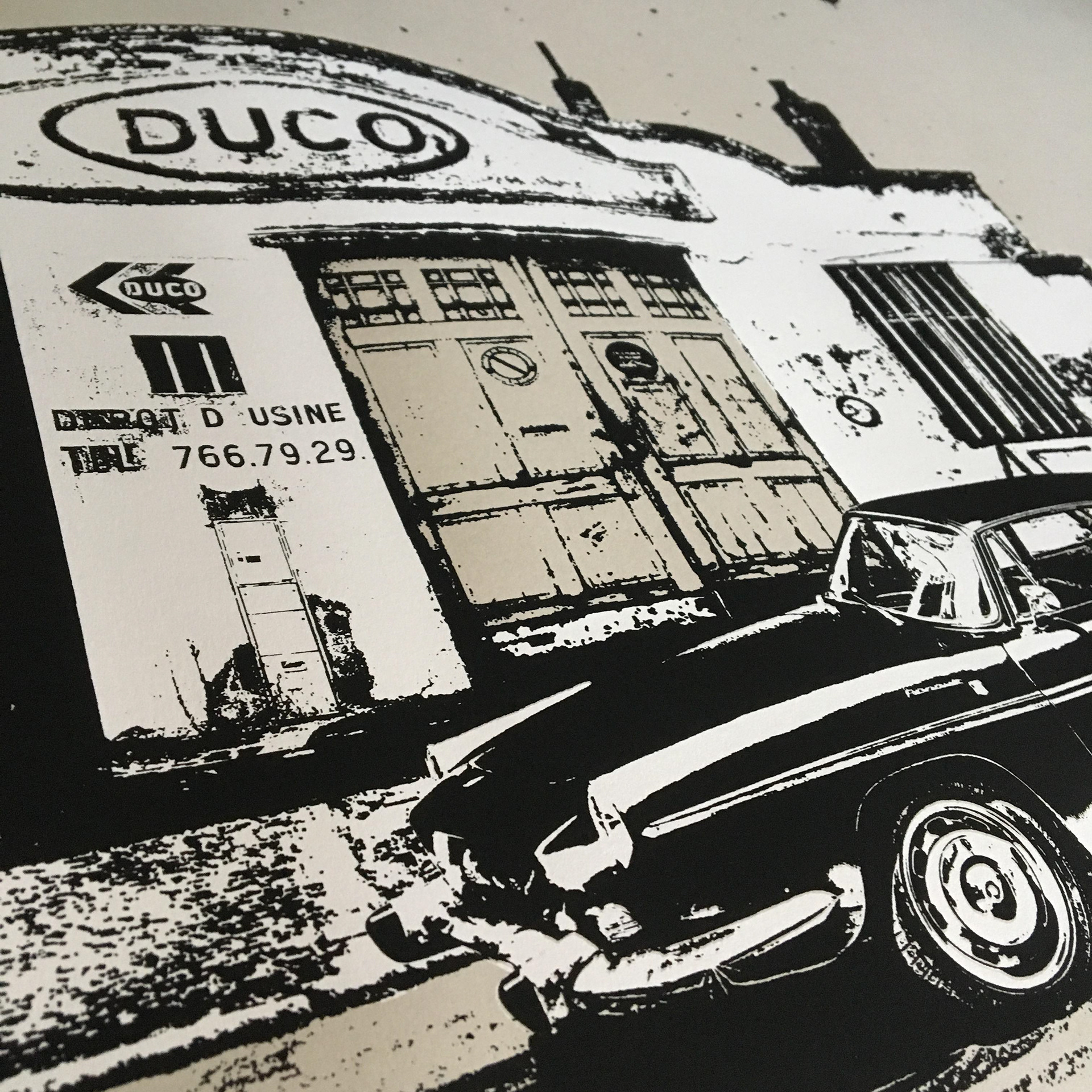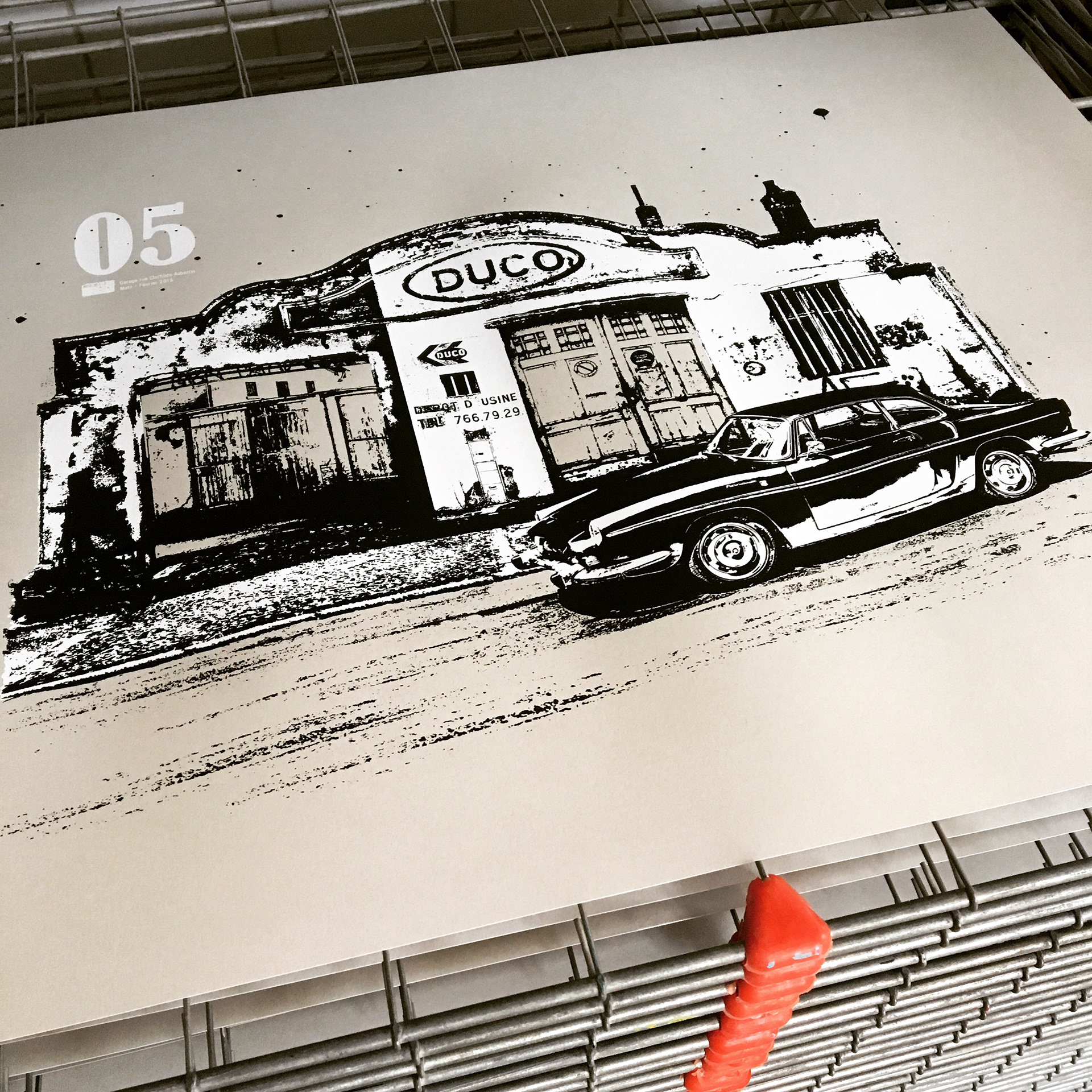 . "Le garage - Rue Clothilde Aubertin". Impression deux couleurs sur papier pop set virgin pulp tourterelle 250g. 22 tirages signés et numérotés, format 50x70 cm.