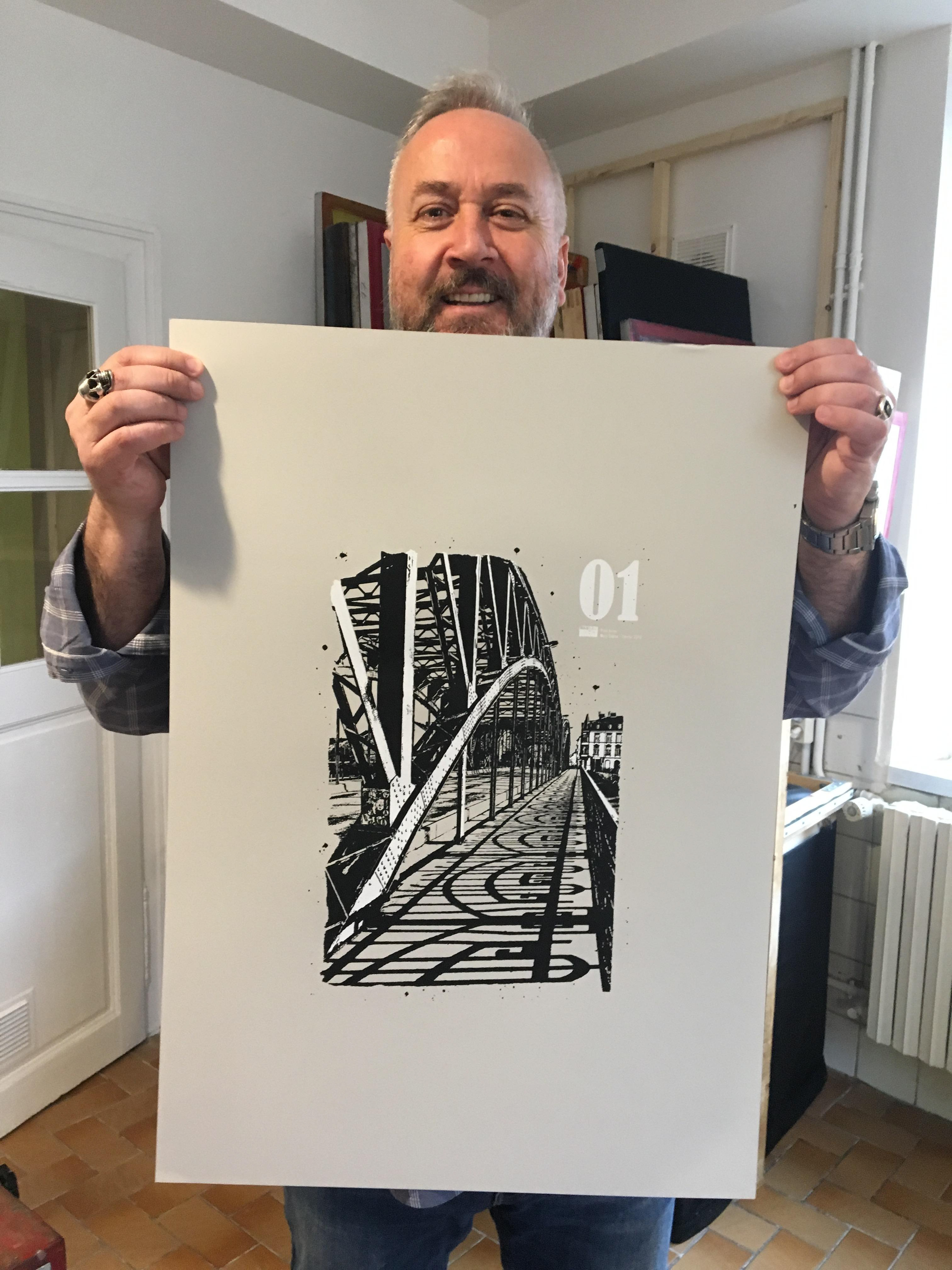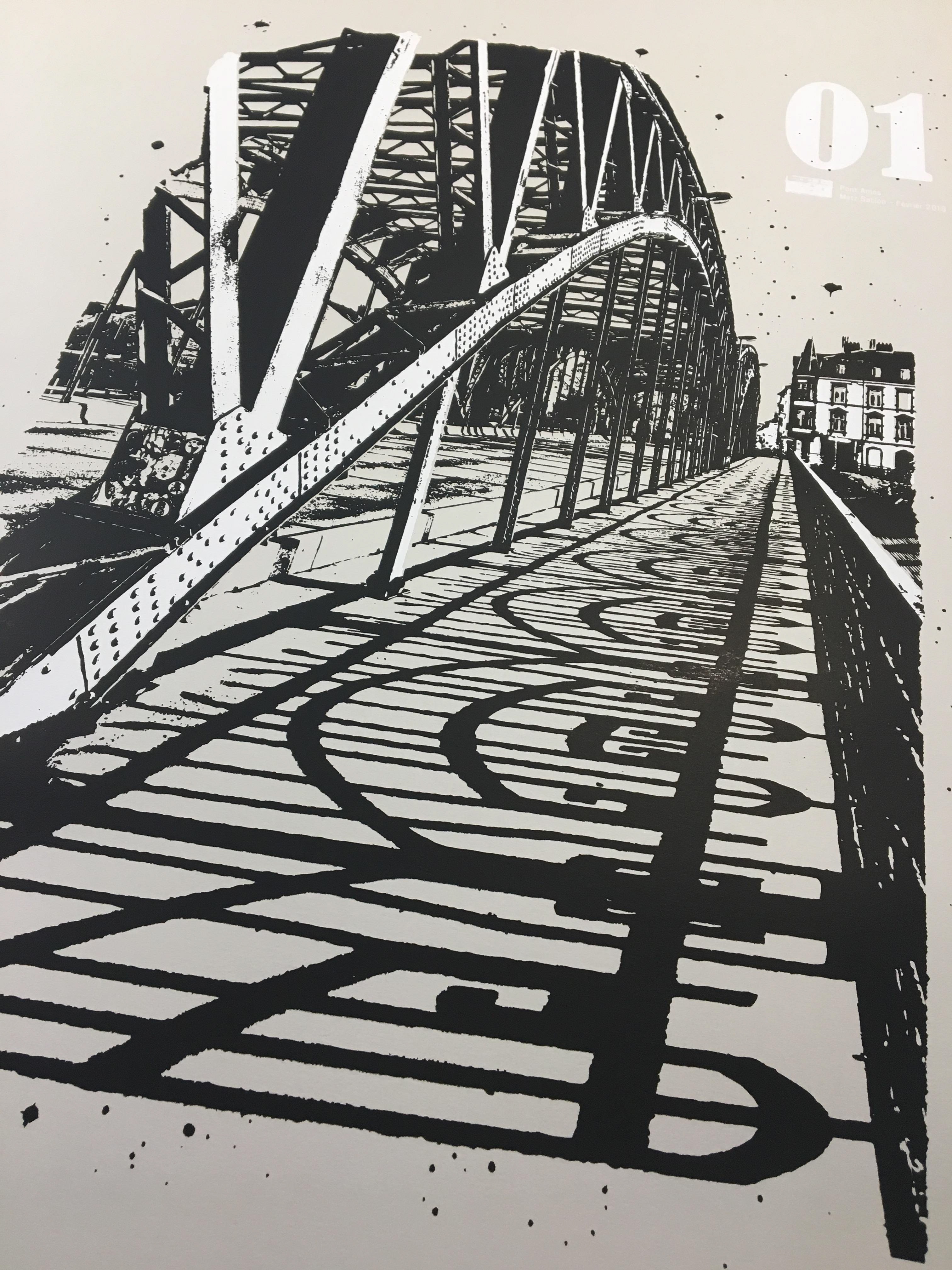 Patrick Secco est photographe. Il a décidé de retravailler certaines de ses images afin de les adapter à la sérigraphie. Première d'une série de dix vue de Metz, "le Pont Amos". Impression deux couleurs sur papier pop set virgin pulp tourterelle 250g. Editée à 40 tirages signés et numérotés, format 50x70 cm.